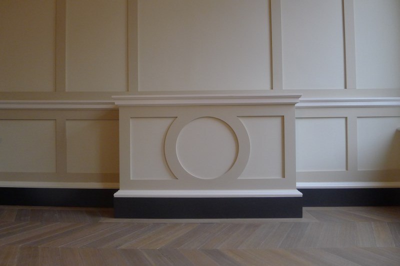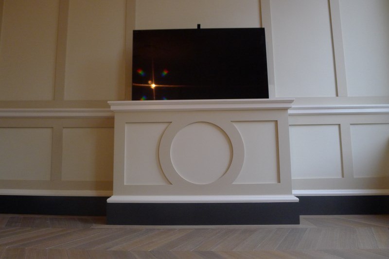 Bijzonderheden: deze kasten maken deel uit van de lambrisering; de tv is op een lift gemonteerd