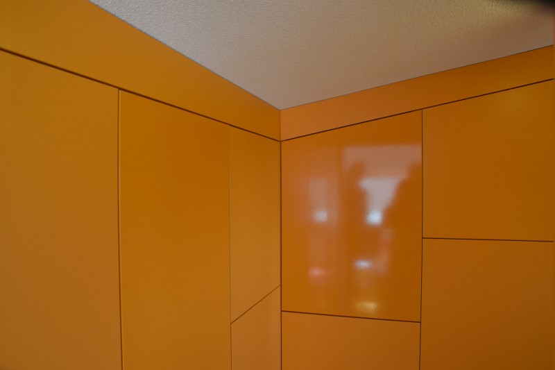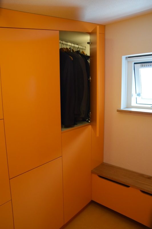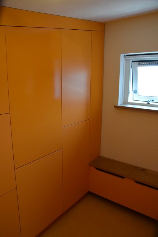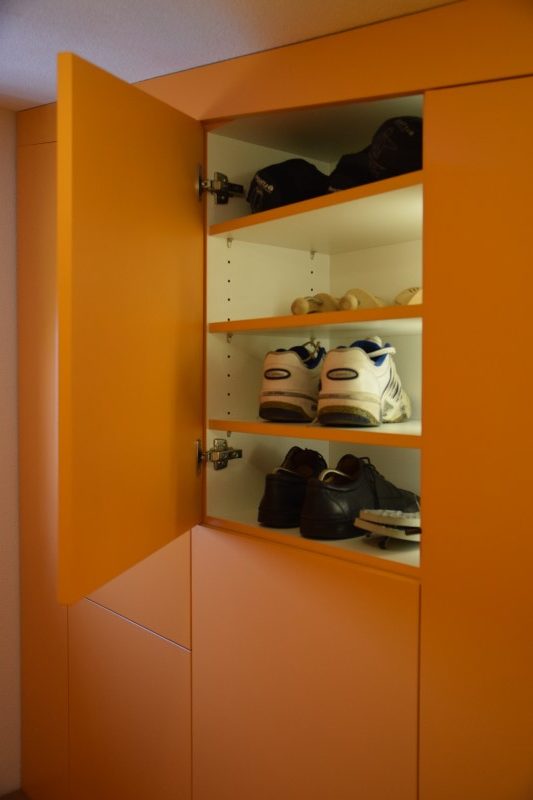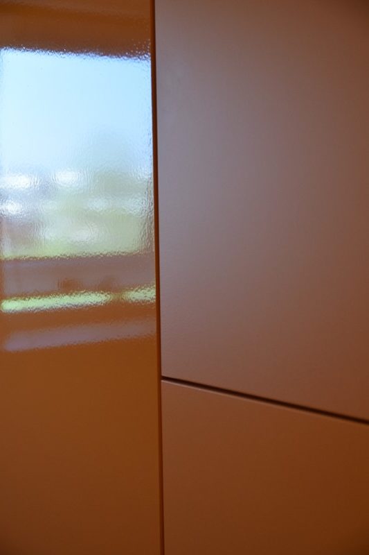 Bijzonderheden: Het is op de foto’s nauwelijks te zien, maar deze kast staat in een ruimte met een steil oplopend plafond, waardoor elke kast een ander formaat heeft. De deuren zijn geschilderd in hoogglans, zijdeglans en mat, dat geeft een speels effect.