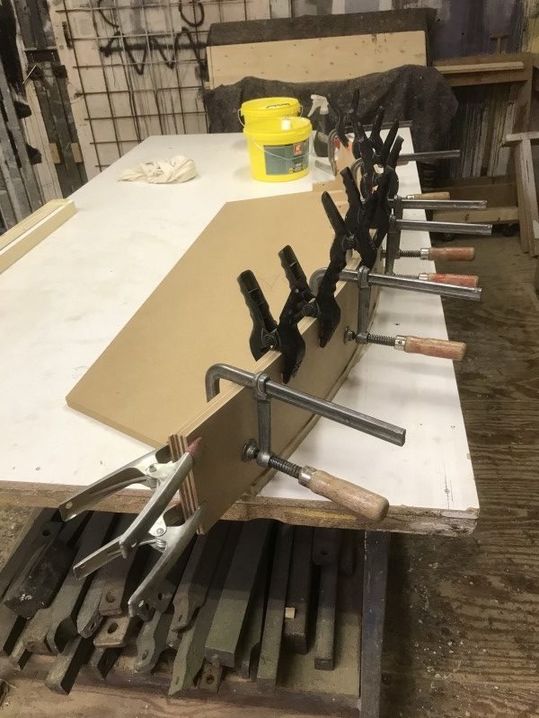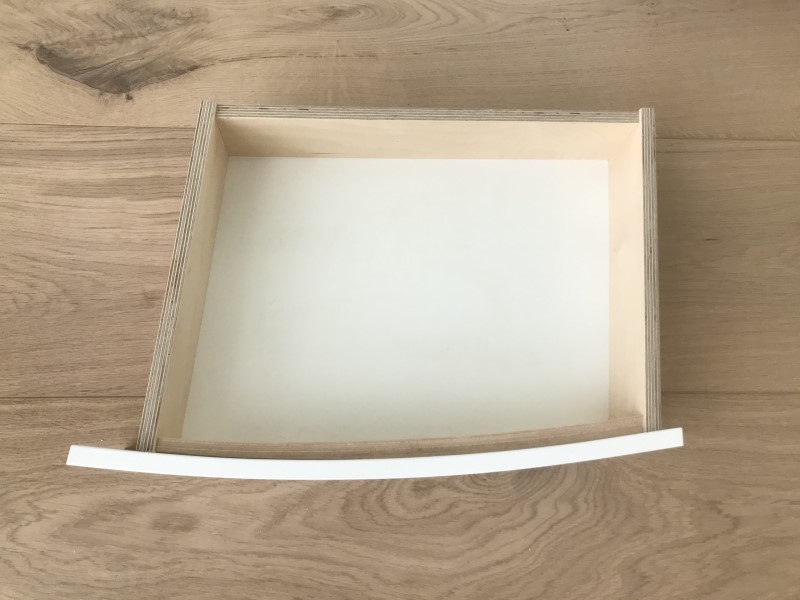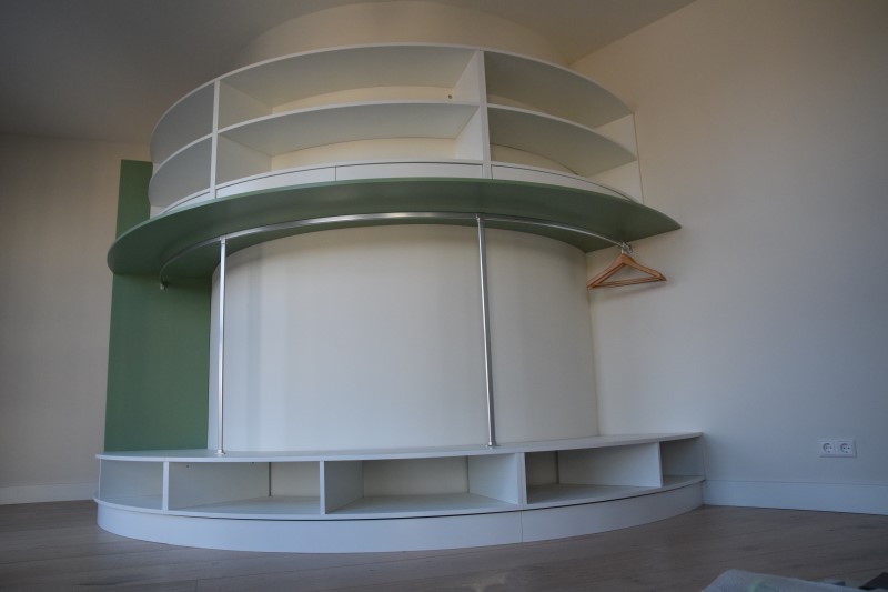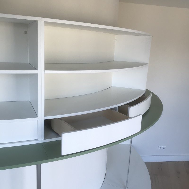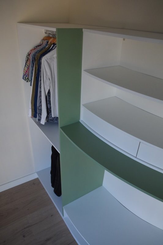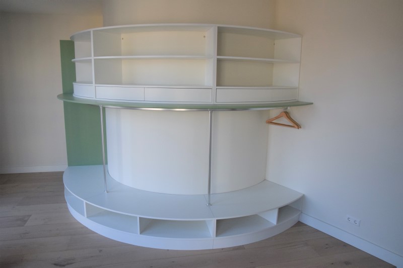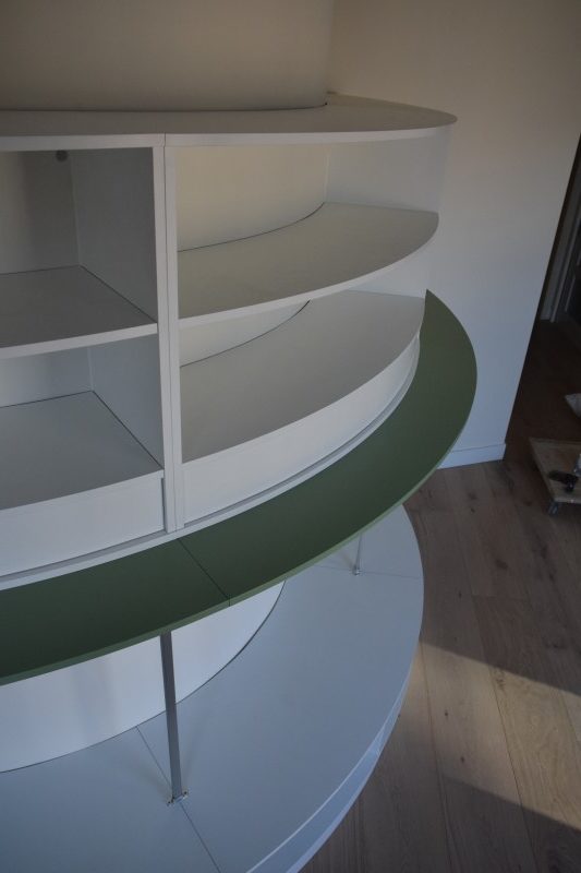 Bijzonderheden: Tja, wat is er niét bijzonder aan deze kast? Hij rolt af over een wand van circa 4 meter, fronten en plinten zijn gebogen. En het zijn zonder twijfel de vreemdst gevormde laden die ik ooit gemaakt heb.